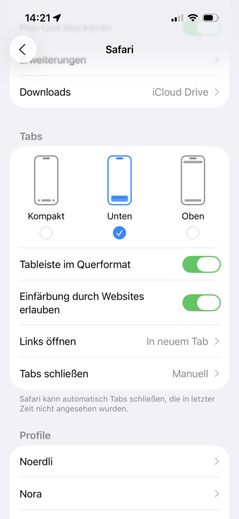 Hier habe ich die Tableiste gleich nach dem Update wieder auf das klassische Design zurückgestellt. Das geht unter: Einstellungen > Apps > Safari > Tabs